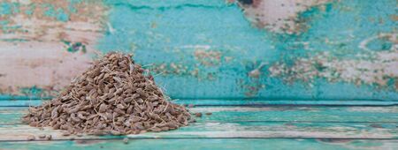 a lot of caraway seeds on a wooden table. Healthy lifestyle concept.