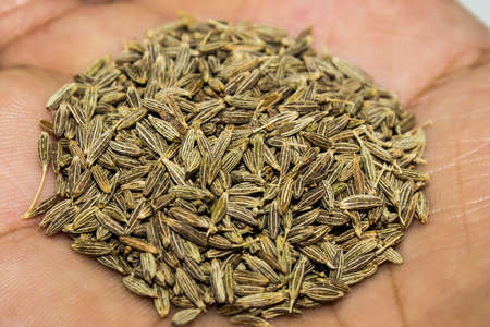 Whole cumin seeds Carum carvi L. in a spoon close-up.