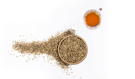 Cumin grain in a spoon composition on a white background. Cumin close up texture. Macro lens.