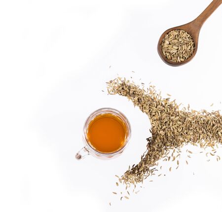 Foeniculum vulgare - Herbal tea fennel tea in glass cup with dried fennel seeds