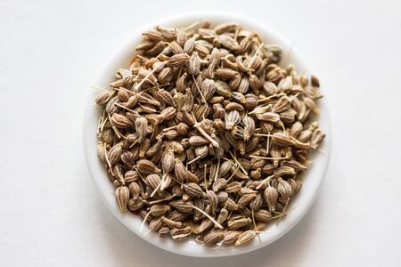 CARAWAY SEEDS carum carvi AGAINST WHITE BACKGROUND