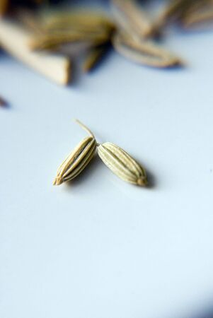 A close-up view of dried fennel seeds scattered on a white background. This image showcases the natural texture and color, perfect for culinary uses.