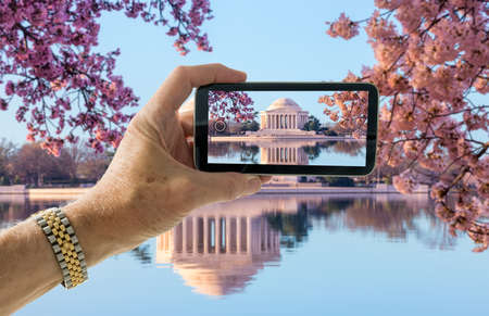 Tourist taking photo on smartphone of cherry blossoms around Jefferson Memorial in Washington DC