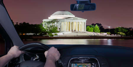 Driving a car towards the Jefferson Memorial at night in Washington DC, USA