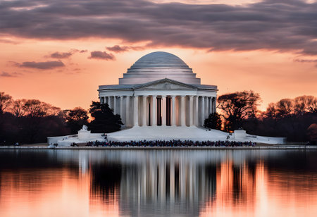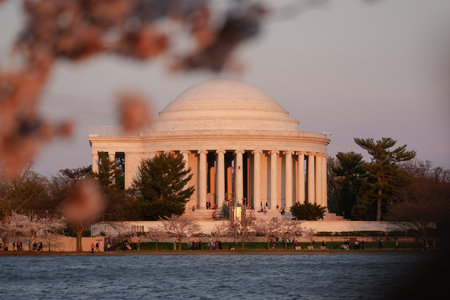 Washington, DC - March 20, 2024: Thomas Jefferson Memorial at sunset during cherry blossom season