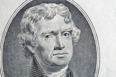 Portrait of the third US President Thomas Jefferson on two dollar banknote bill macro, front side obverse.
