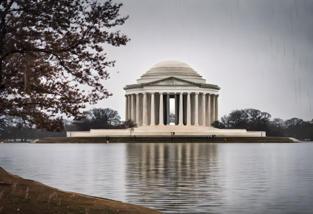 Jefferson Memorial framed by trees on a sunny day in Washington DC, USA, iconic neoclassical landmark. g.
