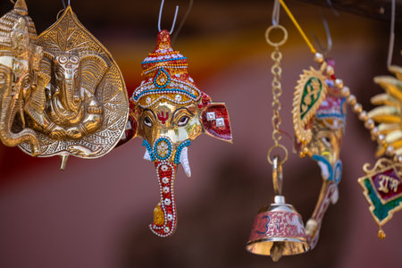 Golden Lord Ganesh small figure hanged outdoor in the garden of temple area, Hindu religious god