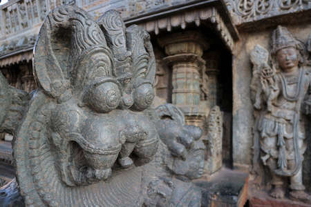 Halebidu, Karnataka, India - November 2, 2013: Hoysaleswara Temple of Shiva. Closeup of lion statues on side of the temple structure in gray stone and some brown background.