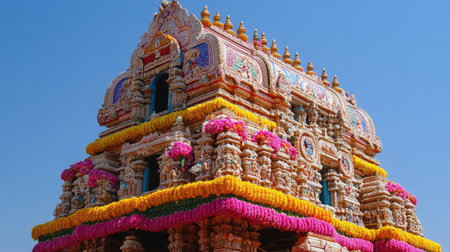 A stunning temple structure showcasing intricate details and vibrant floral decorations. The colorful display against a clear blue sky highlights the artistry and cultural significance of this architectural marvel.