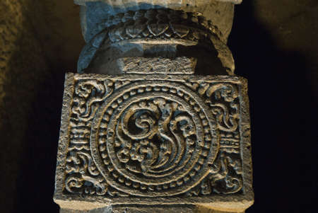 architectural detail close-up of intricate carvings and designs on ancient temple, created with generative ai