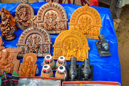 Hand made beautiful Handicrafts of burned earth teracotta sold in the village marked even exported in different foreign countries from the red soil of Bankura district of West Bengal. Teracotta materials are world famous of this area but still the people here is very poor, don't get their proper evaluation and material as well as artist's value. India, Asia, December 2020.