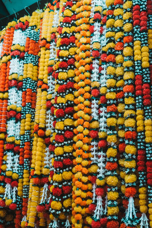 Vertical view garlands with flowers hang on the street in the Indian Quarter in Malaysia. Hindu religious symbol, yellow flowers. Preparation for the wedding ceremony. Fresh flower arrangements, decor