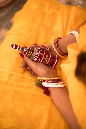 New Delhi, India April 03 2022 - Women with Kalash on head during Jagannath Temple Mangal Kalash Yatra, Indian Hindu devotees carry earthen pots containing sacred water with a coconut on top