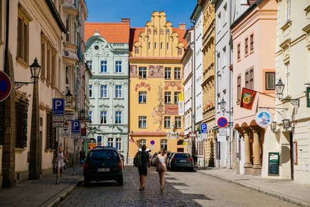 Colorful renaissance historical buildings in the center of Plzen in sunny day. Pilsen, Western Bohemia, Czech Republic, August 1, 2020