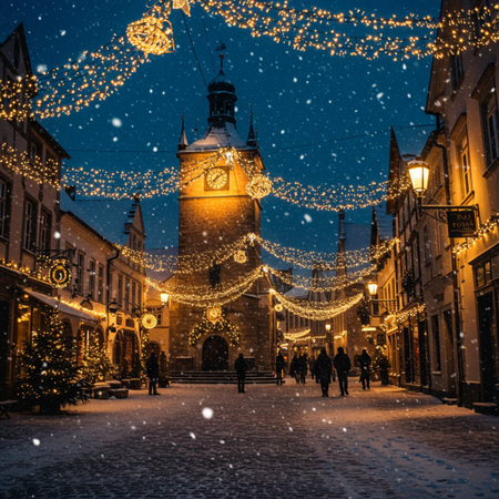 A vertical shot of lit evening streets of Jelenia Góra, Poland.