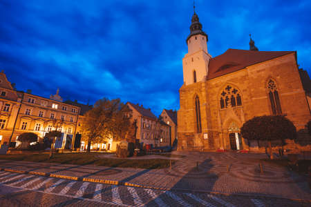 Church of St. James the Greater in Jihlava is a three-aisled hall church with a long presbytery and two tall towers in winter with evening sunset