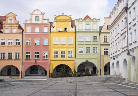Facades of historic tenement houses with arcades on the market in the city of Jelenia Gora in Poland
