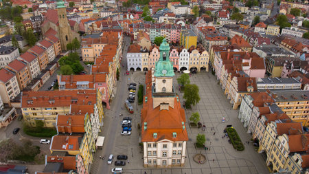 Bird's-eye perspective showcases the vibrant atmosphere of Jelenia Góra's market square, adorned by historic buildings including the 18th-century town hall.