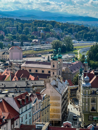 Klodzko, Poland, September 3, 2025: Panorama of Klodzko in Poland, seen from the Klodzko Fortress. Franciscan Church and train station.