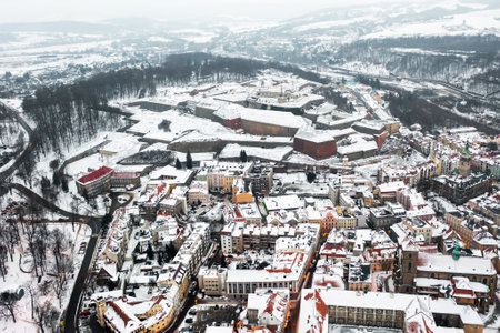 Panoramic aerial view of winter town covered with snow, Klodzko, Poland