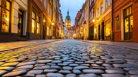 A tranquil cobblestone street is lined with historic buildings and glowing shop windows as dusk settles over the town.