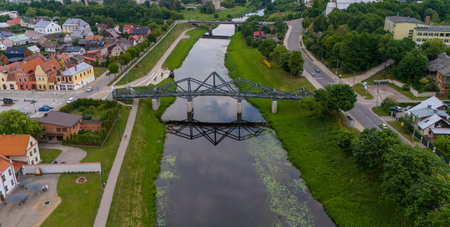 Pedestrian Bridge over Nevezis River in Kedainiai, Lithuania, Aerial Drone View, Kedainiai is a small town in the middle of Lithuania