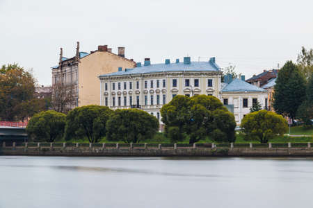 Embankment of the 30th Guards Corps with trees and apartment buildings in overcast day, Vyborg, Leningrad Oblast, Russia