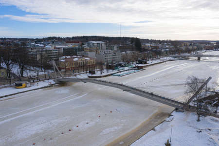 Finland, Porvoo. March 3, 2021. View of the Porvoonjoki river and the city center in winter. Sunny day. Photo from the drone. A high resolution.