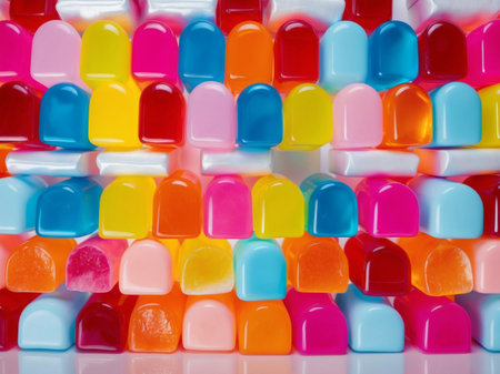 An array of colorful fruit jellies, including raspberry, lemon, and orange flavors, arranged in a repeating geometric pattern on a soft pastel yellow surface. The composition is illuminated by gentle studio lighting, enhancing the vibrant hues and creating a cheerful atmosphere. Ideal for culinary blogs, recipe cards, or as a decorative element in kitchen designs. AI-generated illustration.