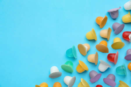 Tasty bright jelly cups on light blue background, flat lay. Space for text