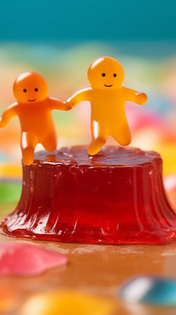 Colorful gummy bears sit against a vibrant, abstract background, evoking a sense of joy and playfulness. Perfect for candy and dessert themes.