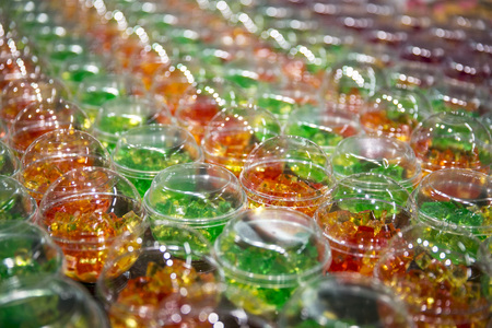 A row of vibrant jelly cups in assorted colors is displayed against a soft pink background showcasing their transparent shapes and textures.