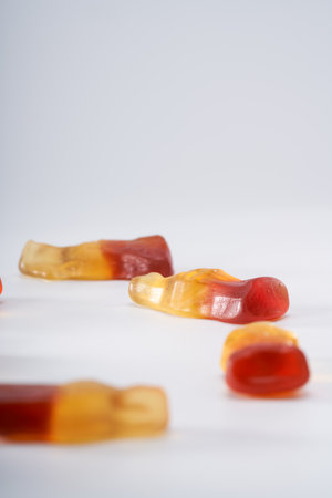 Closeup of colorful gummy bears jelly candies scattered diagonally isolated on white background
