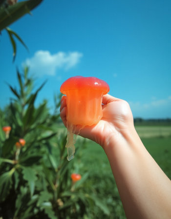 Red jelly heart in hand on the background of the field and blue sky