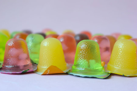 Colorful jellies in plastic bowls arranged in a pile and photographed from above (Selective Focus, Focus on the rim of the left red jelly)