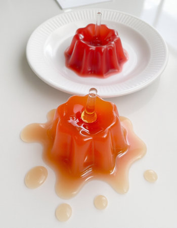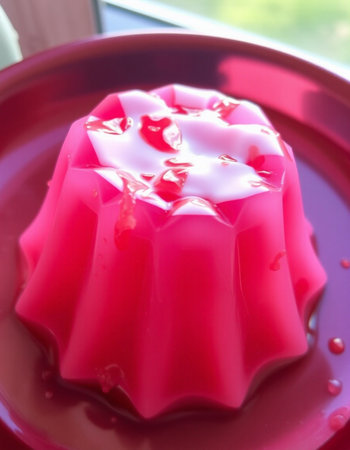 Photo of a vibrant jelly dessert in a fluted mold on a plate.
