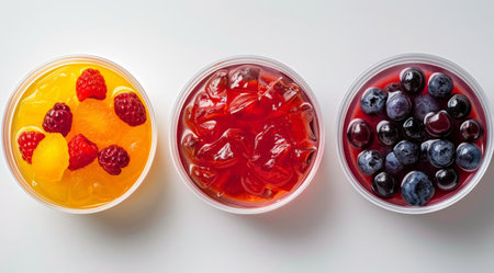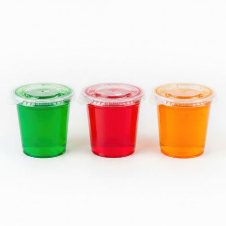Colorful jelly cups are neatly displayed on a bright white surface.