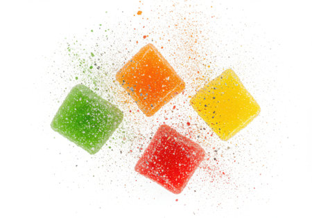 Tiny gelatin cubes in different colors and flavors are scattered on a white surface, creating a vibrant and tempting display of sugary delights ideal for candy lovers.