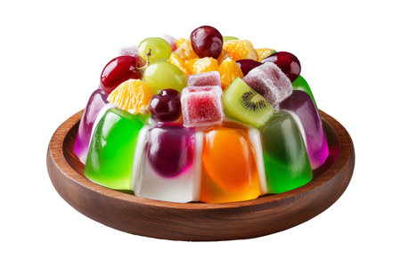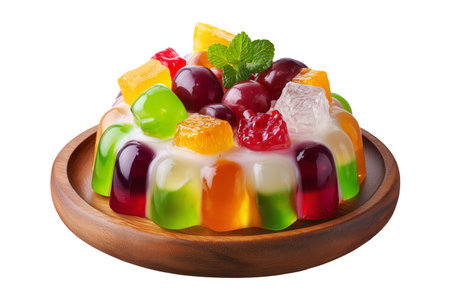 Jelly salad dessert topped with fresh berries, mint leaves, marshmallows and candy on wooden plate isolated on white transparent background, concept of sweet fruity freshness