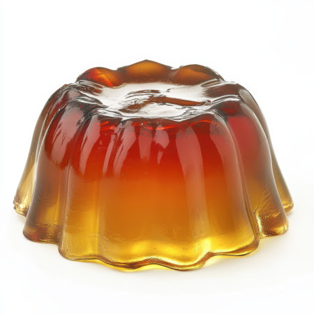 A vibrant gelatin dessert, shaped in a fluted mold, glistens under light with rich golden hues. It sits alone on a clean white surface, ready to be enjoyed.
