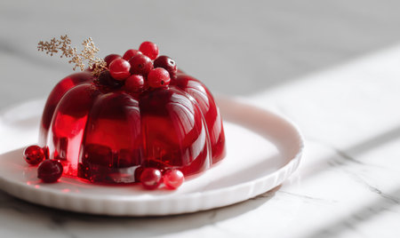A red jelly dessert with cranberries on top. It is on a white plate. The plate is on a marble counter
