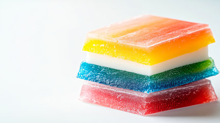 Vibrant jelly layers in shades of pink orange blue and yellow create a striking display against a light blue background.