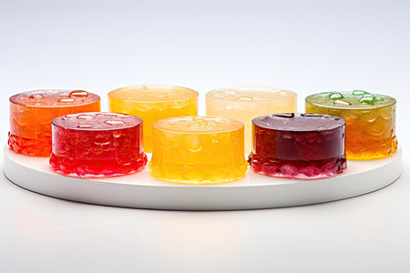 Iridescent jelly delight on reflective surface with vivid colors concept of colorful art, sweet dessert, food photography, creative design, visual aesthetics.