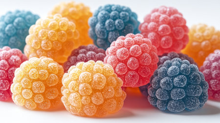 A vibrant assortment of gummy raspberry treats in various colors, radiating sweetness.