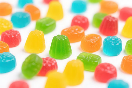 A playful arrangement of multicolored gummy candies on a white surface, capturing the sweet and sugary appeal of these popular treats.