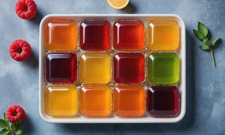 A tray of colorful gelatin squares sits on a gray background, with raspberries and a sprig of mint scattered around
