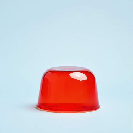 A vibrant red jelly dome is centered against a light blue background showcasing its glossy surface and simple shape.
