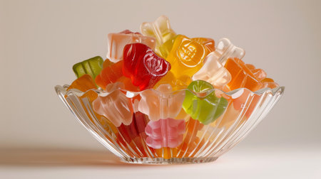 Clear bowl of colorful sweets, negative space around, minimalistic shot.