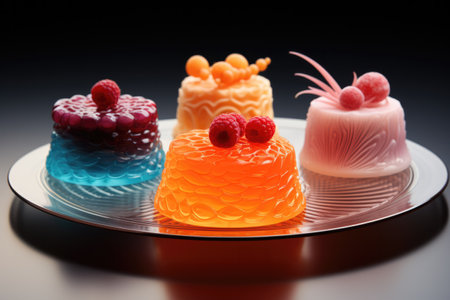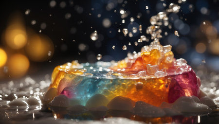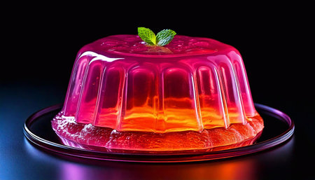 Vibrant jelly dessert with neon colors on a sleek black surface illuminated softly